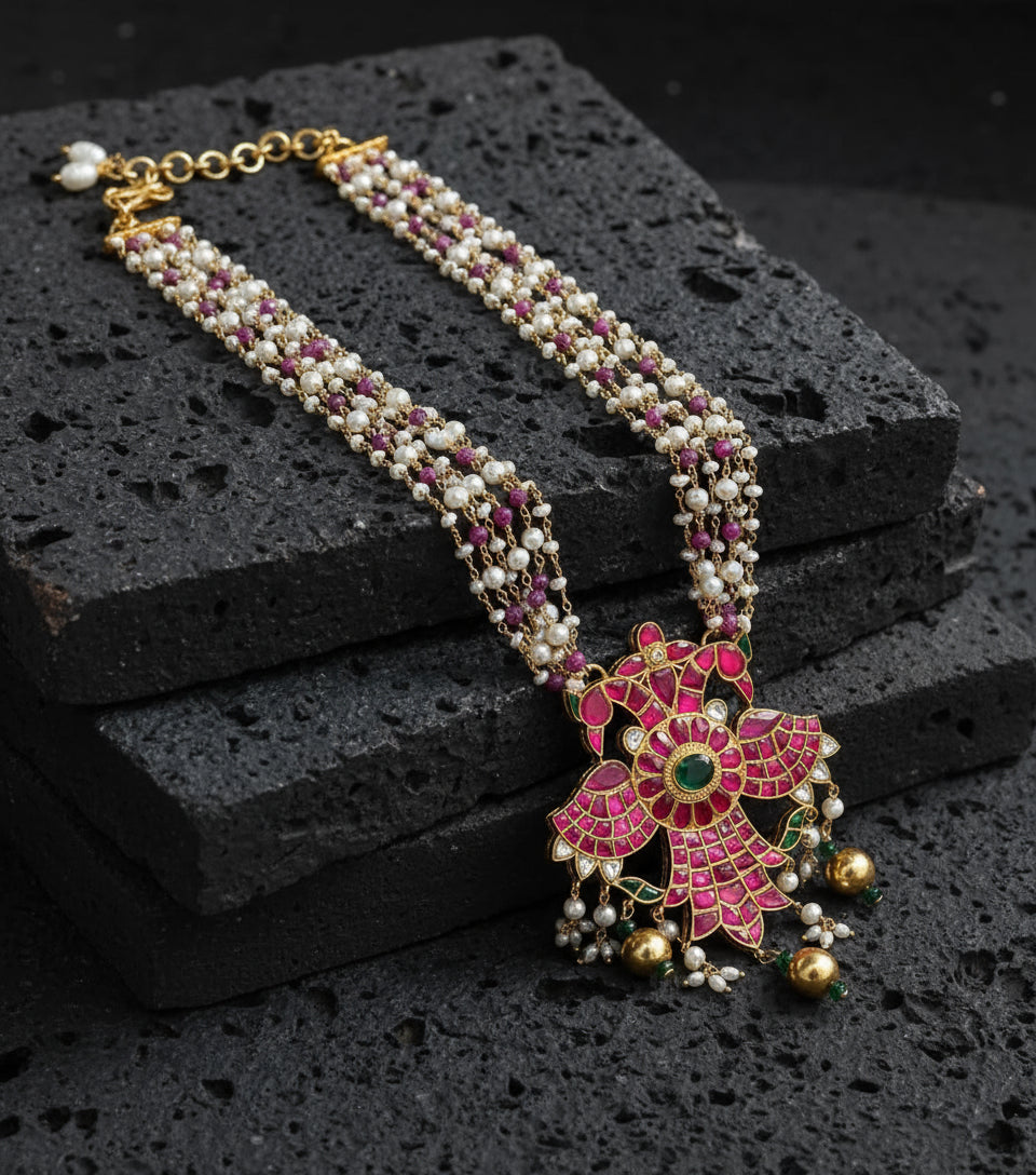 Our collection varies from Tribal Silver Jewellery like vintage silver jewellery, jaipur jewellery, layered silver necklace, dholki bead necklace, kolhapuri thushi to south indian jewels like Jadau Kundan Jewellery, kemp jewellery like addigai, kasu mala, kemp jhumka, Classic South Indian Temple Jewellery Necklaces and more.