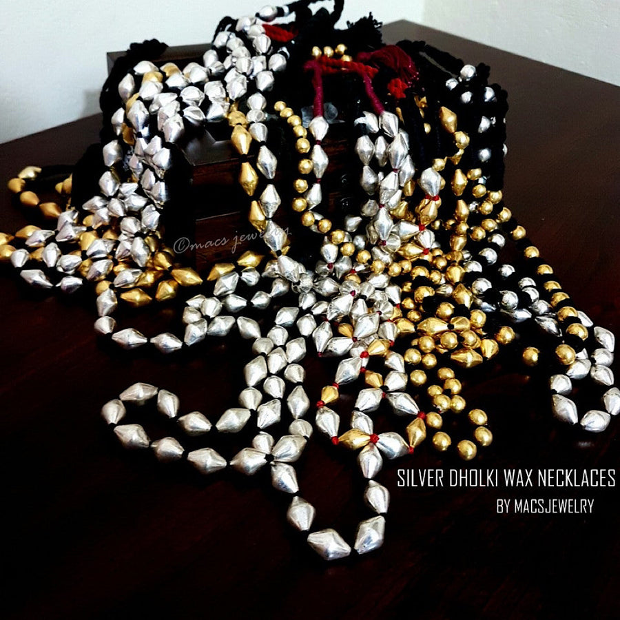 Single line Gold Dholki Beads Silver Necklace Product will be made in black thread unless requested. Mention thread color choice in order note Made to Order: 7-10 days Number of beads used will not be same in each production. Necklace is usually...